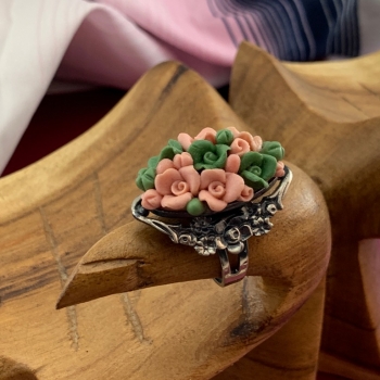 -SOLDOUT-オランダ 70s ヴィンテージリング パンフラワー 指輪 グリーン ピンク 花 コスチュームジュエリー