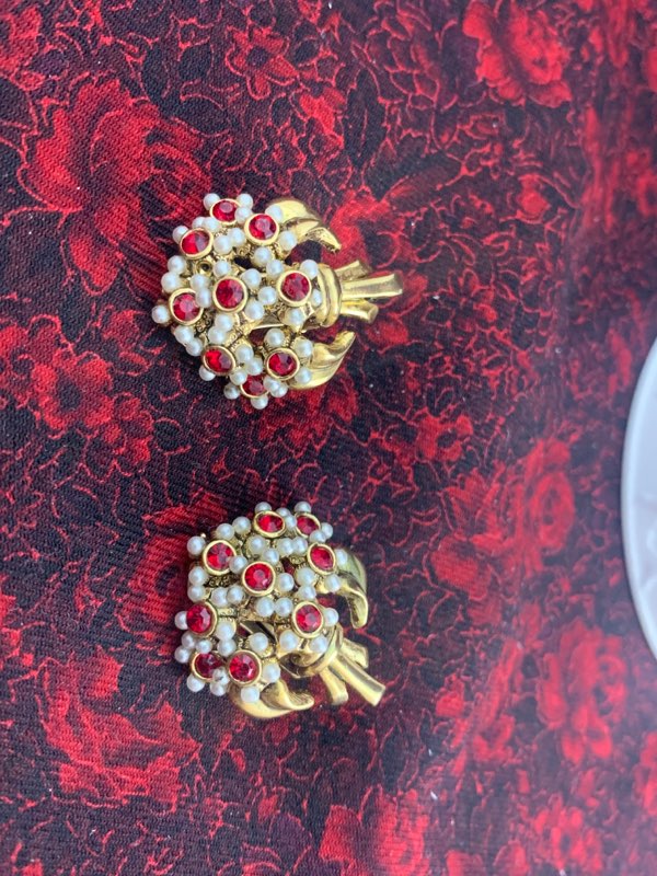 -SOLDOUT-フランス 70s ヴィンテージイヤリング 花束 ゴールドトーン ルビーラインストーン イミテーションパール コスチュームジュエリー  (GA00001532)