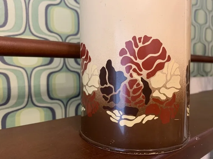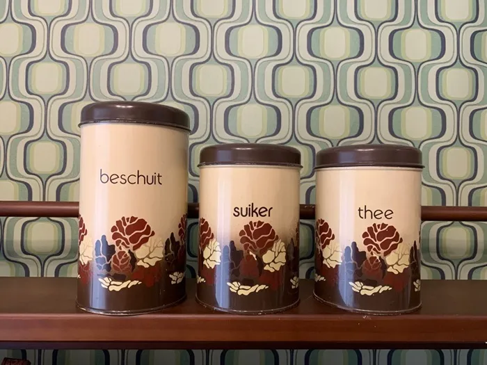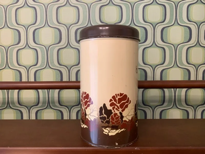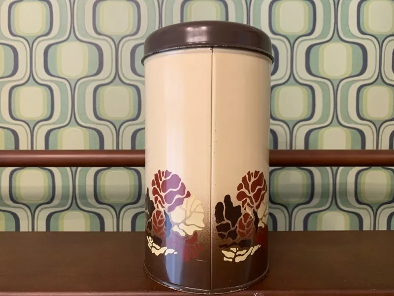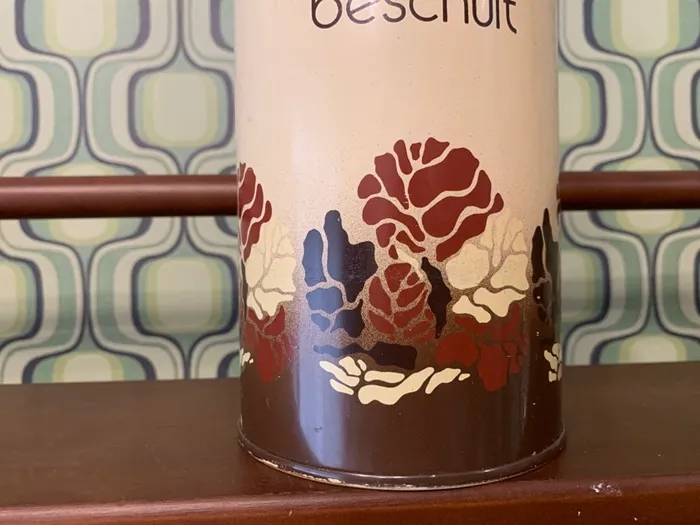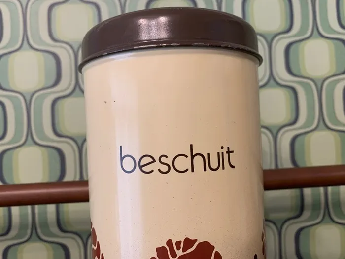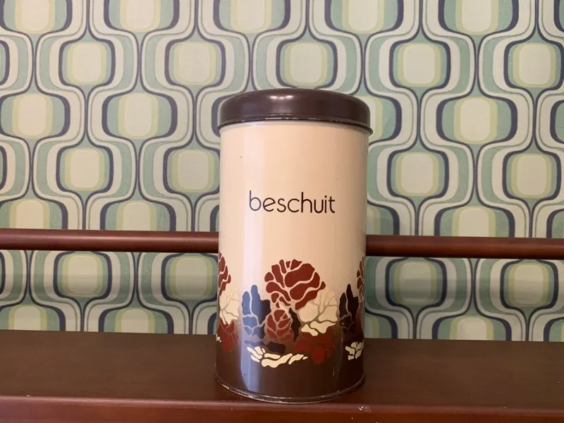 オランダの蚤の市で出会った、ブラウンの草花がアブストラクトに描かれたレトロで可愛らしいヴィンテージ・アンティークティン缶/ビスケットキャニスター缶。「beschuit」はオランダ語でビスケットを意味します。