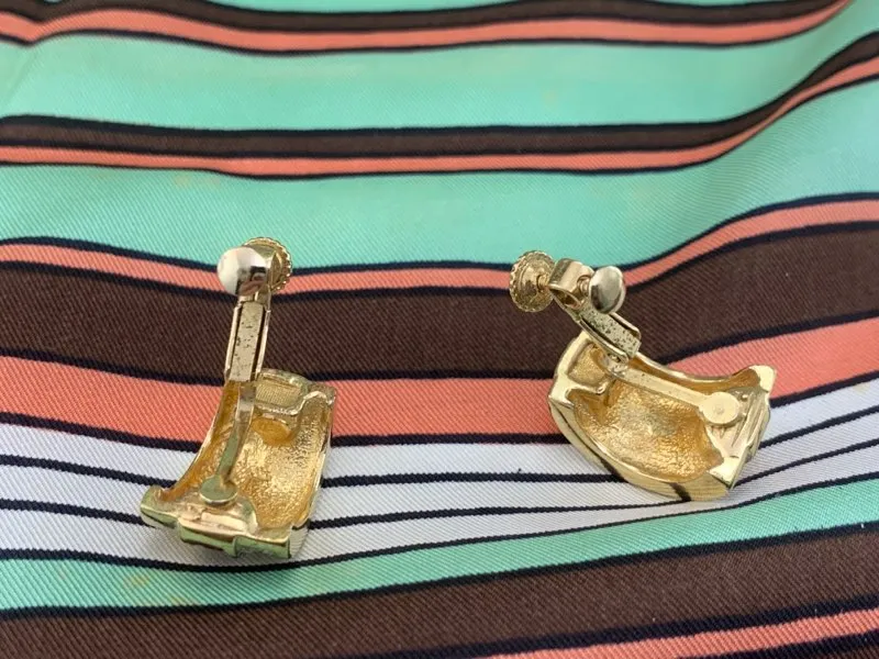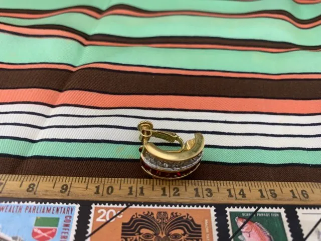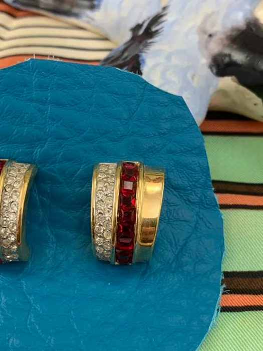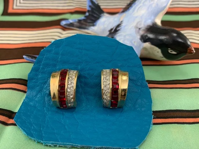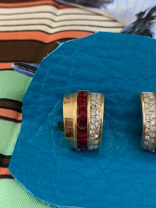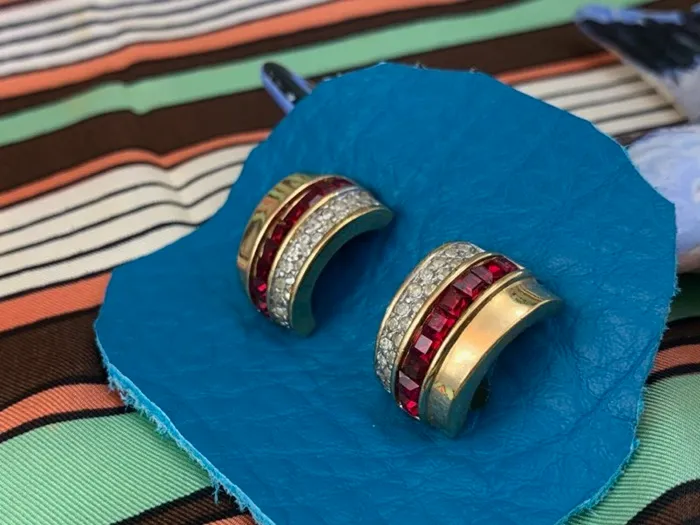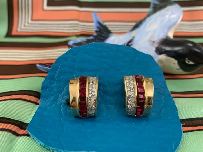 アメリカのアンティークマーケットで出会った、ルビーガラスのとクリアーラインストーンがクラシックで優雅なハーフフープのヴィンテージイヤリング。