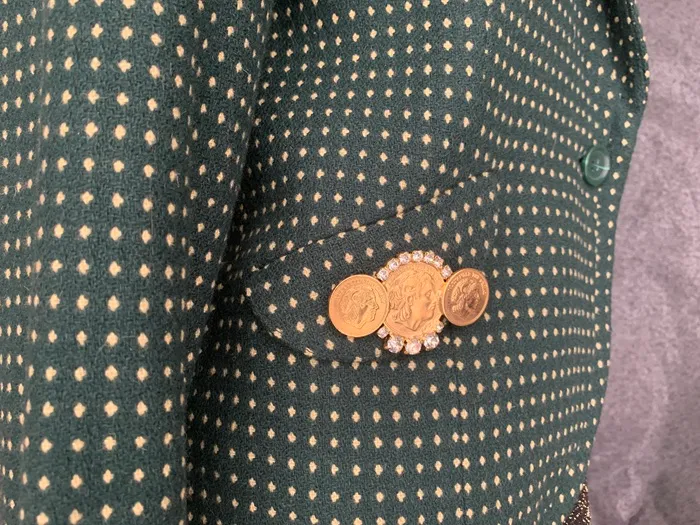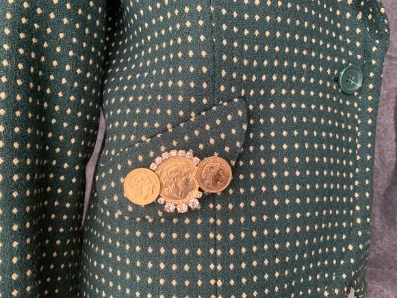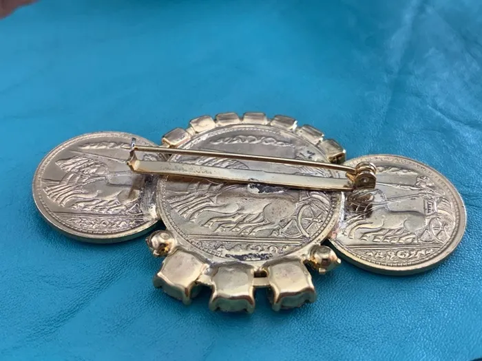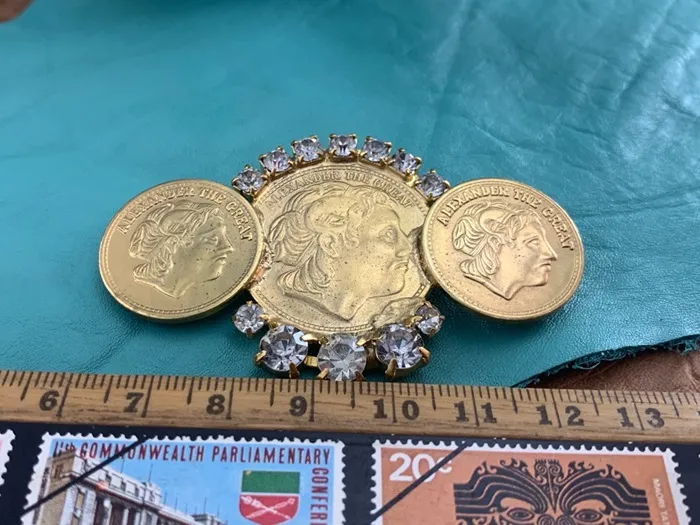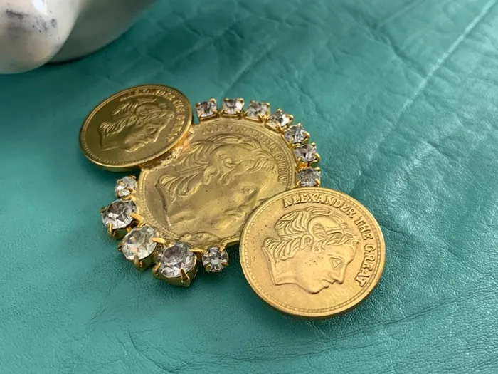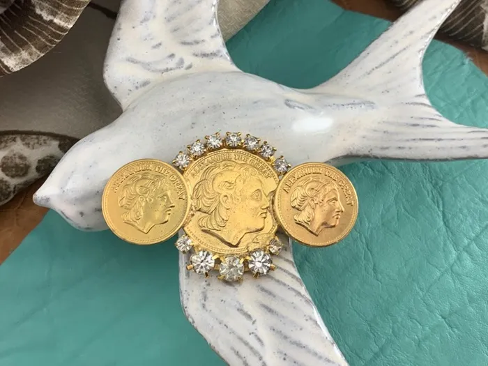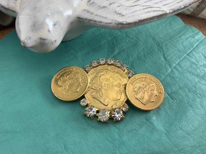 アメリカ 70s アレクサンドロス3世 ブローチ ゴールド コイン ヴィンテージ アメリカ 70s アレクサンドロス3世 ブローチ ゴールド コイン ヴィンテージ (GB0000464) 販売価格(税込)¥4,200在庫状態 : 在庫有りアメリカのアンティークマーケットで出会った、古代ギリシャアレクサンドロス3世をモチーフにした3枚のゴールド調のコインとラインストーンが優雅で美しいヴィンテージブローチ。 コンディション 特記されていない限り、大きなダメージ等はございませんが、ヴィンテージ・アンティーク品になりますので、使用感や傷等はございます。お写真をご参照の上ご購入頂きますようお願い申し上げます。 ブランド 不明 生産国 不明 購入国 アメリカ 年代 1980年頃 サイズ 素材 メタル/ラインストーン 値段 4,200円(税込み) ご購入頂く前に、必ずこちらの「お買い物ガイド」をご参照ください。 商品コード:GB0000464 数量 関連商品 Kirks Folly カークス フォリー ブローチ 天使 ヴィンテージ フランス 80s ブローチ 大粒 ブラック ゴールド ヴィンテージ -SOLDOUT-アメリカ 80s ゴールド調 ヴィンテージ・アンティーク ブローチ ミツバチ 蜂 イミテーションパール ラインストーン コスチュームジュエリー アメリカ 80s ブローチ 管楽器 サックス ゴールド ヴィンテージ -SOLDOUT-アメリカ 80s MONET(モネ) ゴールド ラインストーン お花 ヴィンテージブローチ コスチュームジュエリー