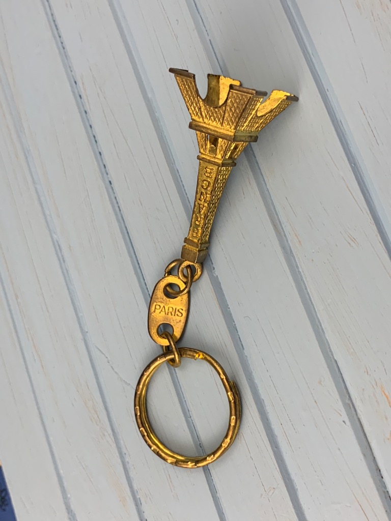 フランスの蚤の市で出会った、シャビ―なゴールドがクラシックで可愛らしいエッフェル塔のヴィンテージキーホルダー。当時のお土産雑貨。FRANCEとPARISの文字がエンボスで施されています。
