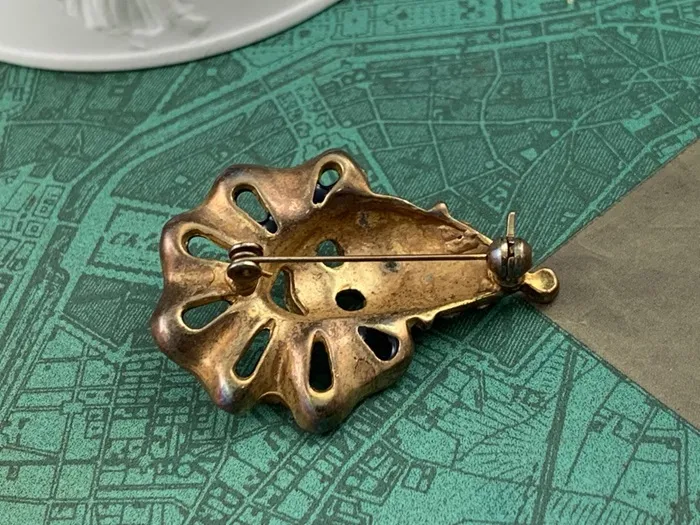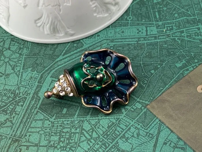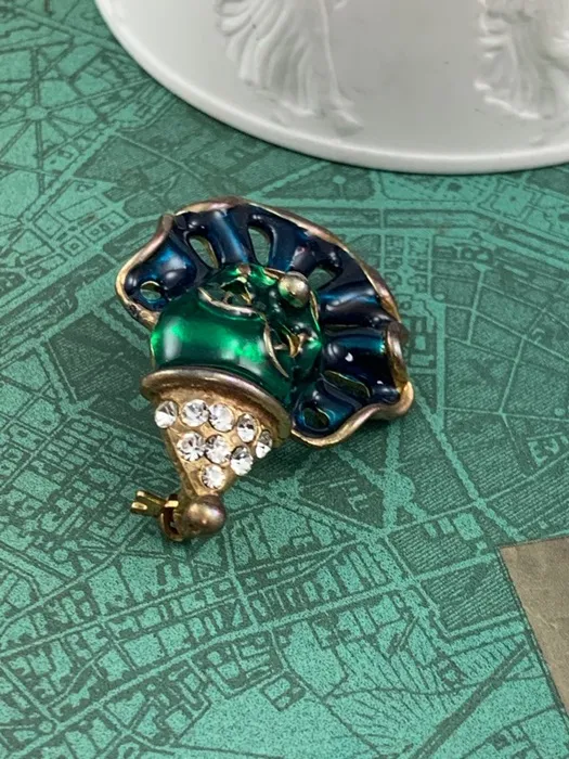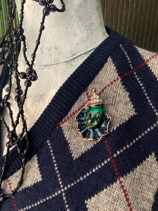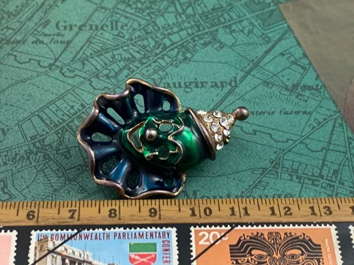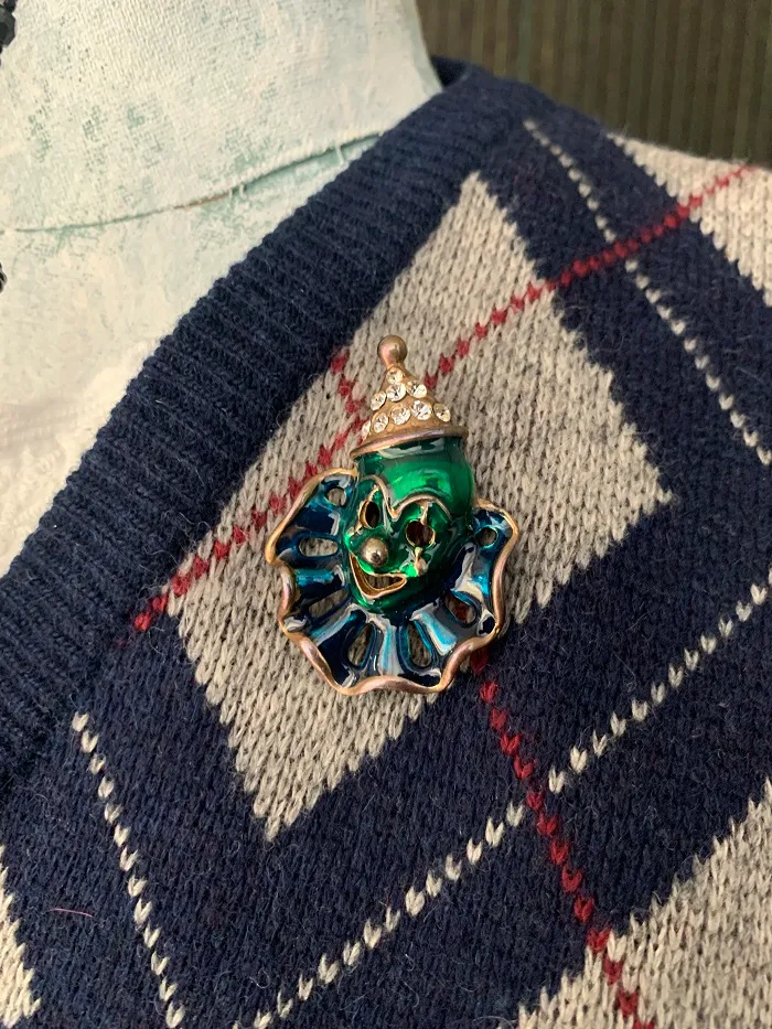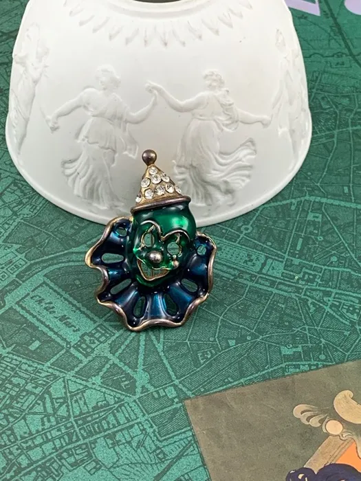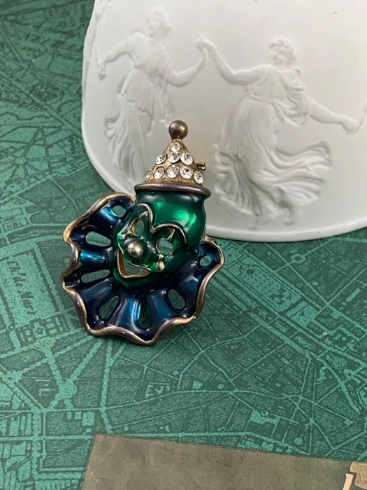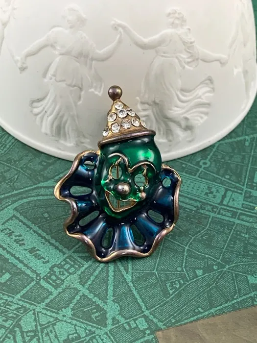 アメリカのアンティークマーケットで出会った、帽子にラインストーンが施されたダークグリーンとブルーのエナメルがクラシックで可愛らしいピエロのヴィンテージブローチ。