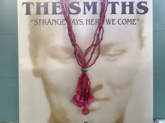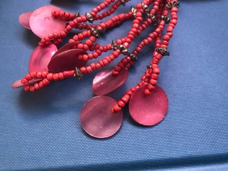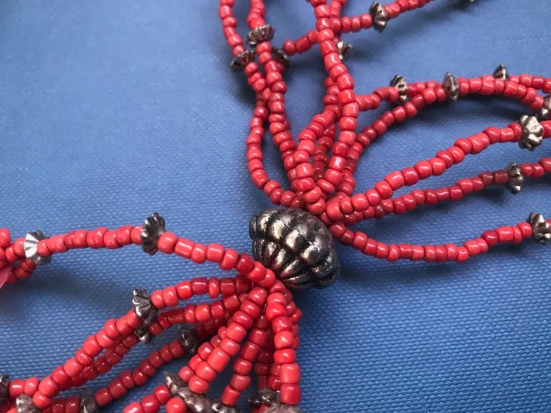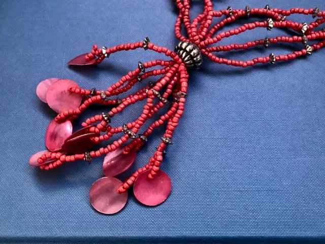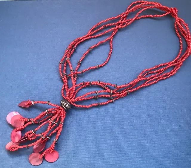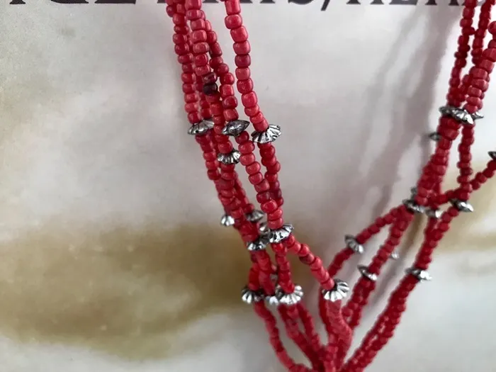 アメリカのアンティークマーケットで出会ったクラシックな5連レッドビーズを基調のメタルシルバーがアクセントのヴィンテージボヘミアンネックレス。ネックレス先端には赤い貝殻のようなモチーフがゆらゆら施されています。カジュアルな古着や華やかなドレス等、さまざまなシーンで着用できます。