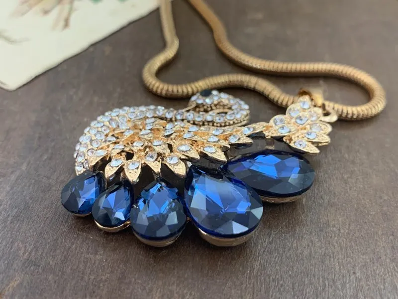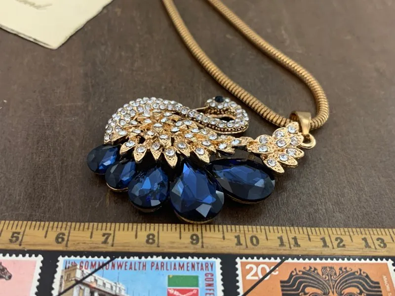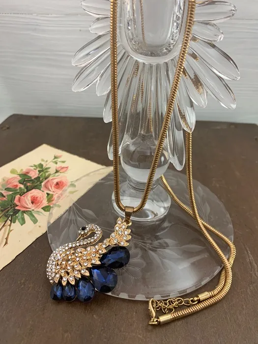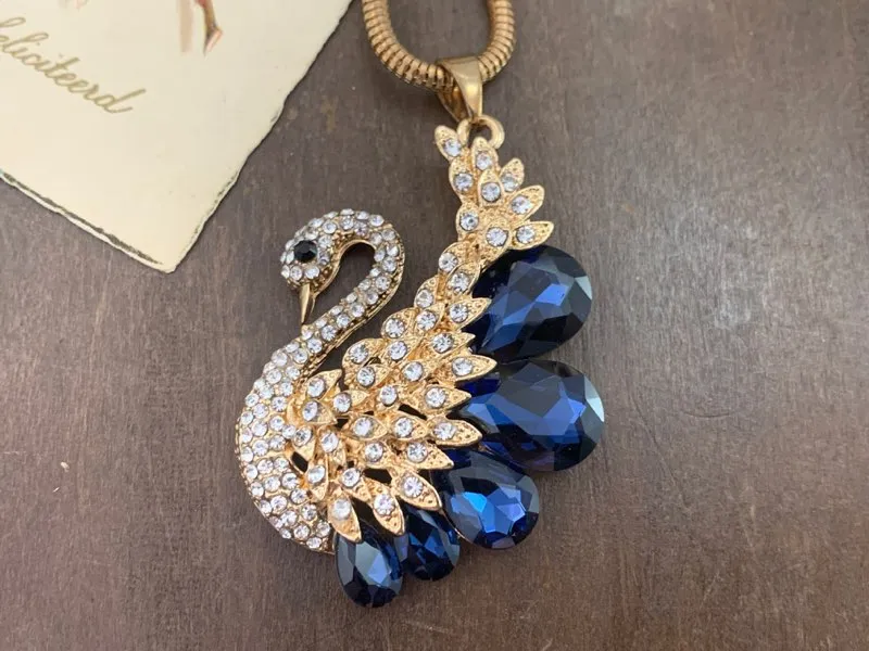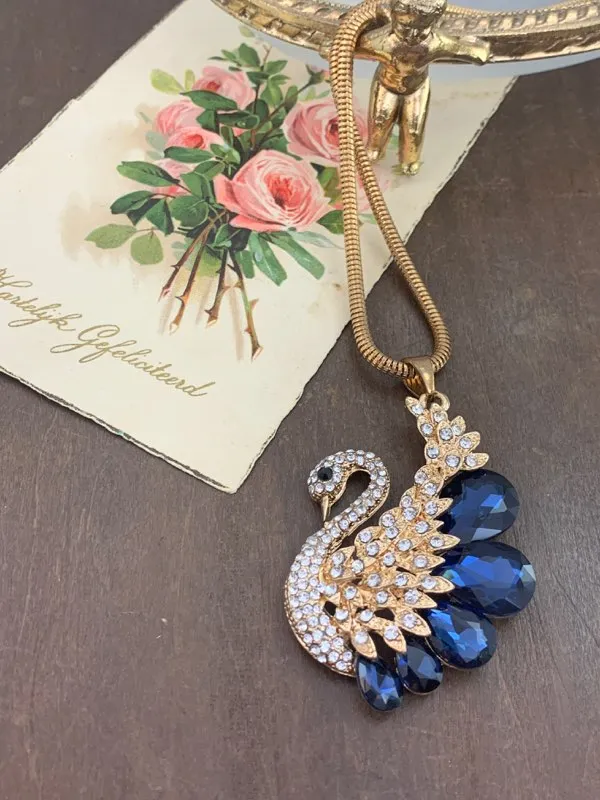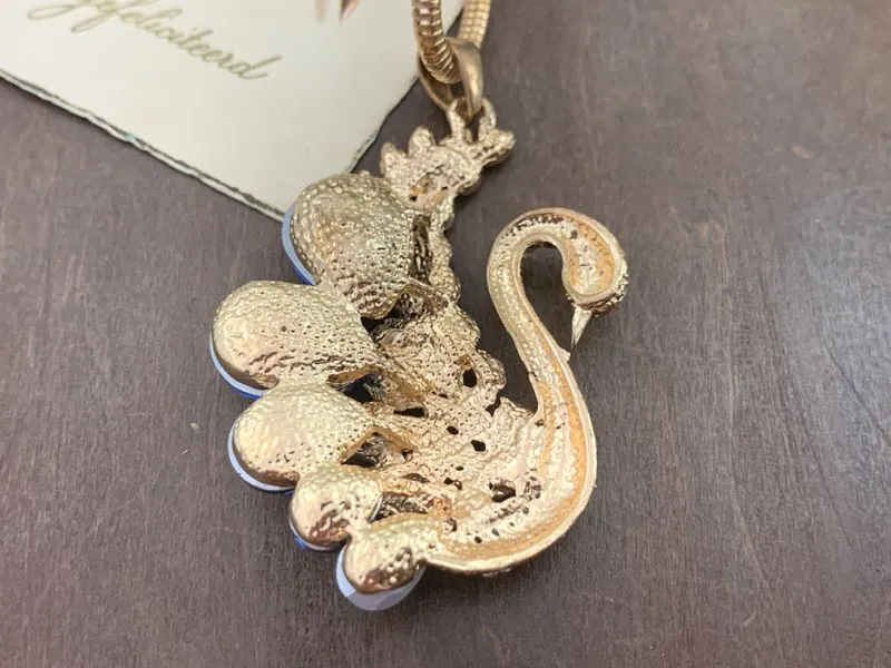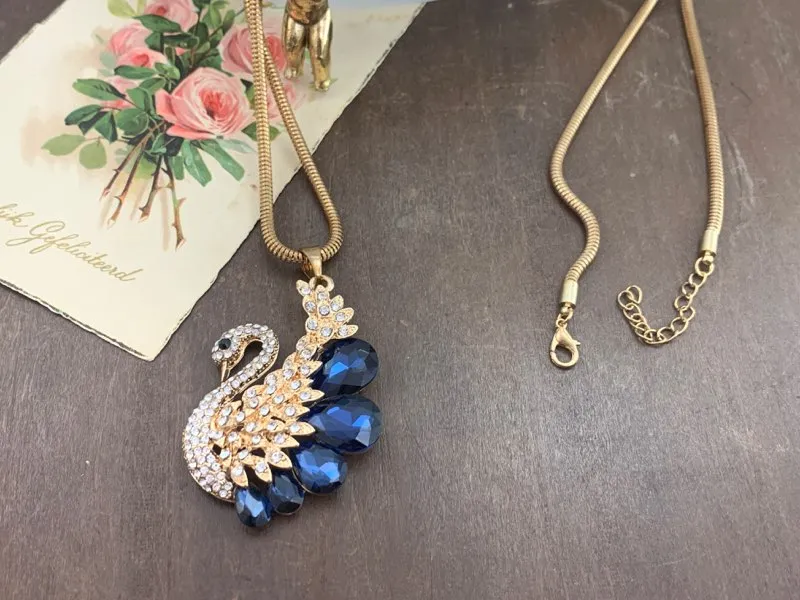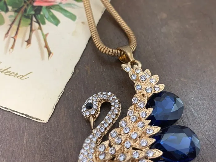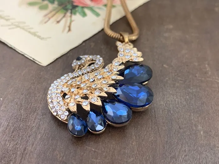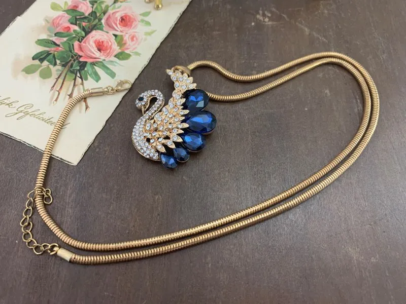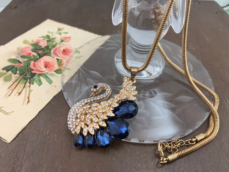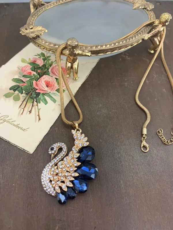 フランスの蚤の市で出会った、美しく輝くブルーラインストーンが羽の部分に施された白鳥のヴィンテージネックレス。ラインストーンが全体に散りばめられた気品高い作品です。※チェーン交換可能