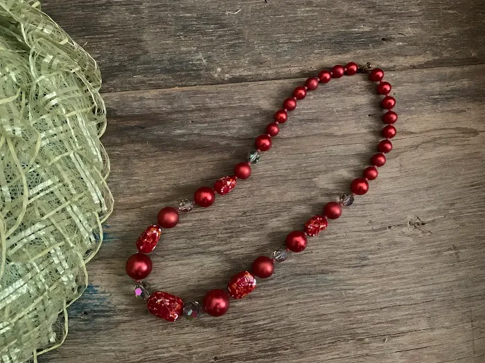 ドイツの蚤の市で出会った、赤いフェイクストーン、プラスチックビーズ、多面カットのガラスのグリーンビーズがレトロで美しいヴィンテージネックレス。