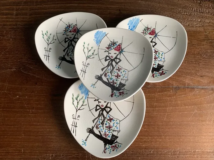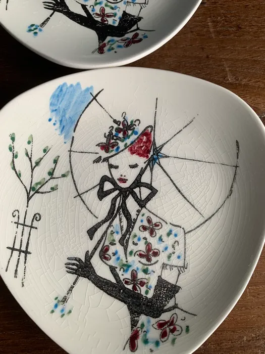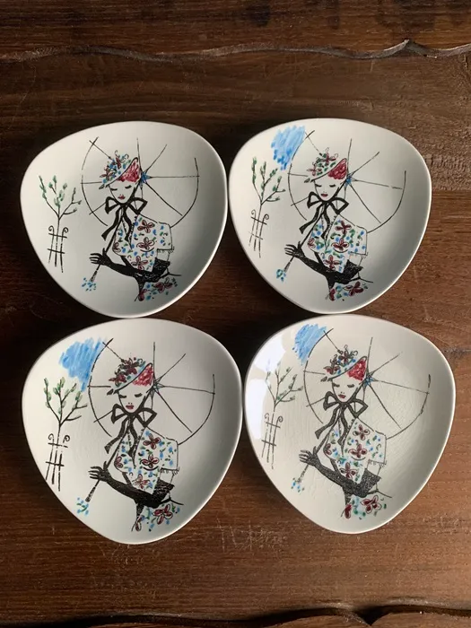 1950年代から1970年代にかけて陶器製品を製造販売していたドイツの陶磁器会社「Limburg Echt Dom-Keramik」の陶器ヴィンテージプレート・ケーキ皿。傘をさした女性のイラストがクラシックで可愛らしいお皿です。2枚セット。※オランダからの直送品です。