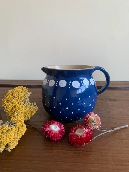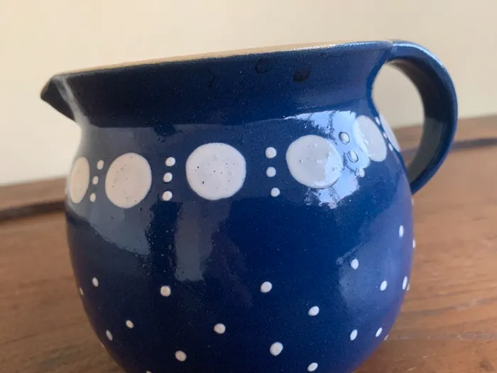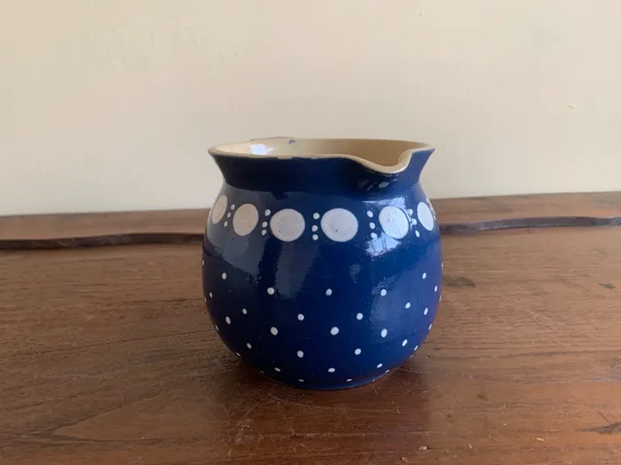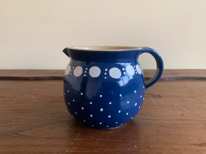ドイツの蚤の市で出会った、コバルトブルーと白いドットがレトロで可愛らしい陶器製ヴィンテージ水差し・ジャグ。※オランダからの直送品です。